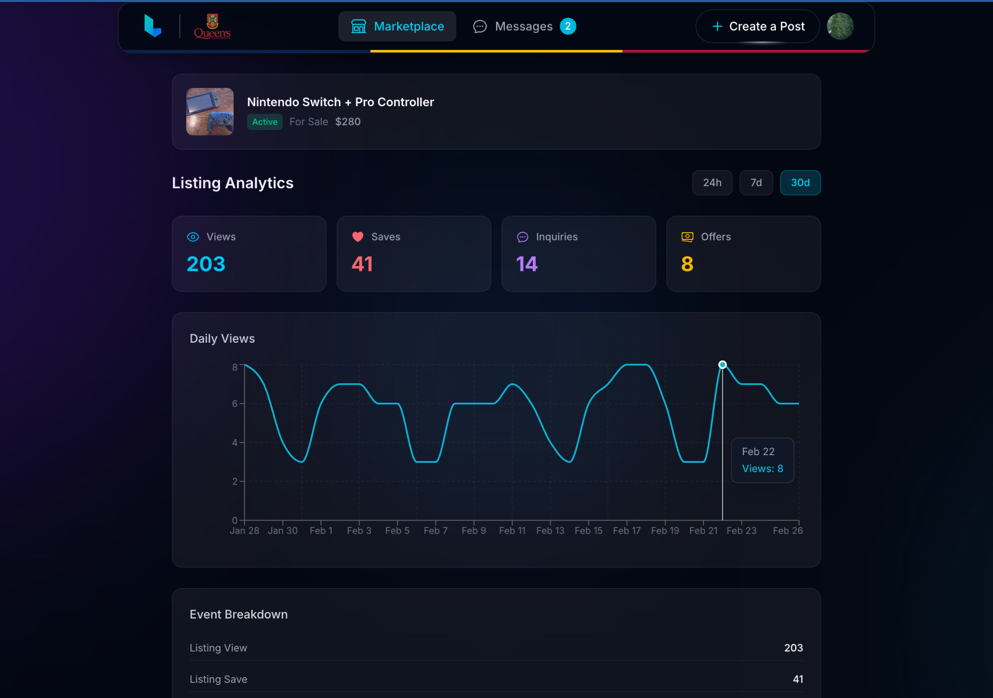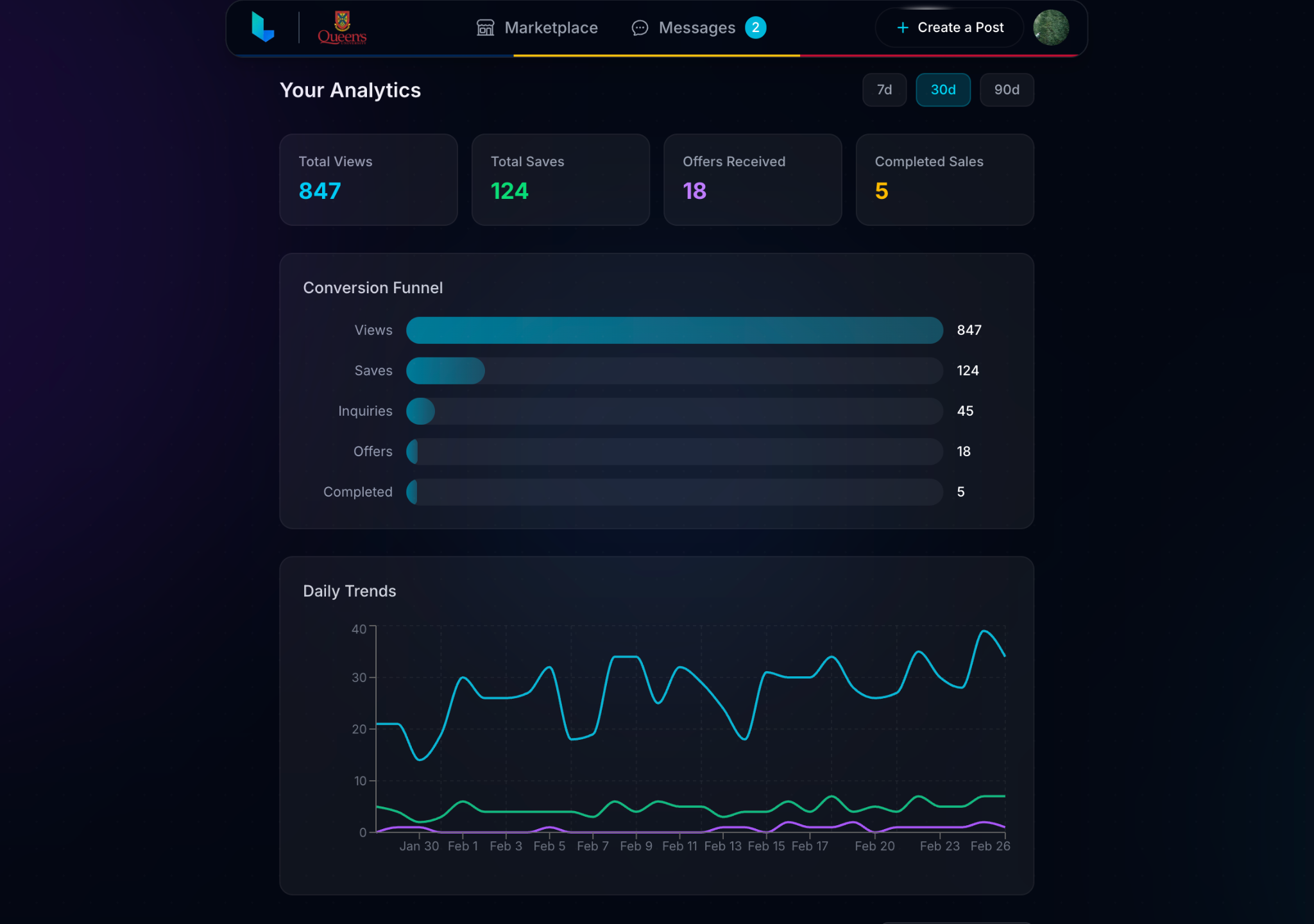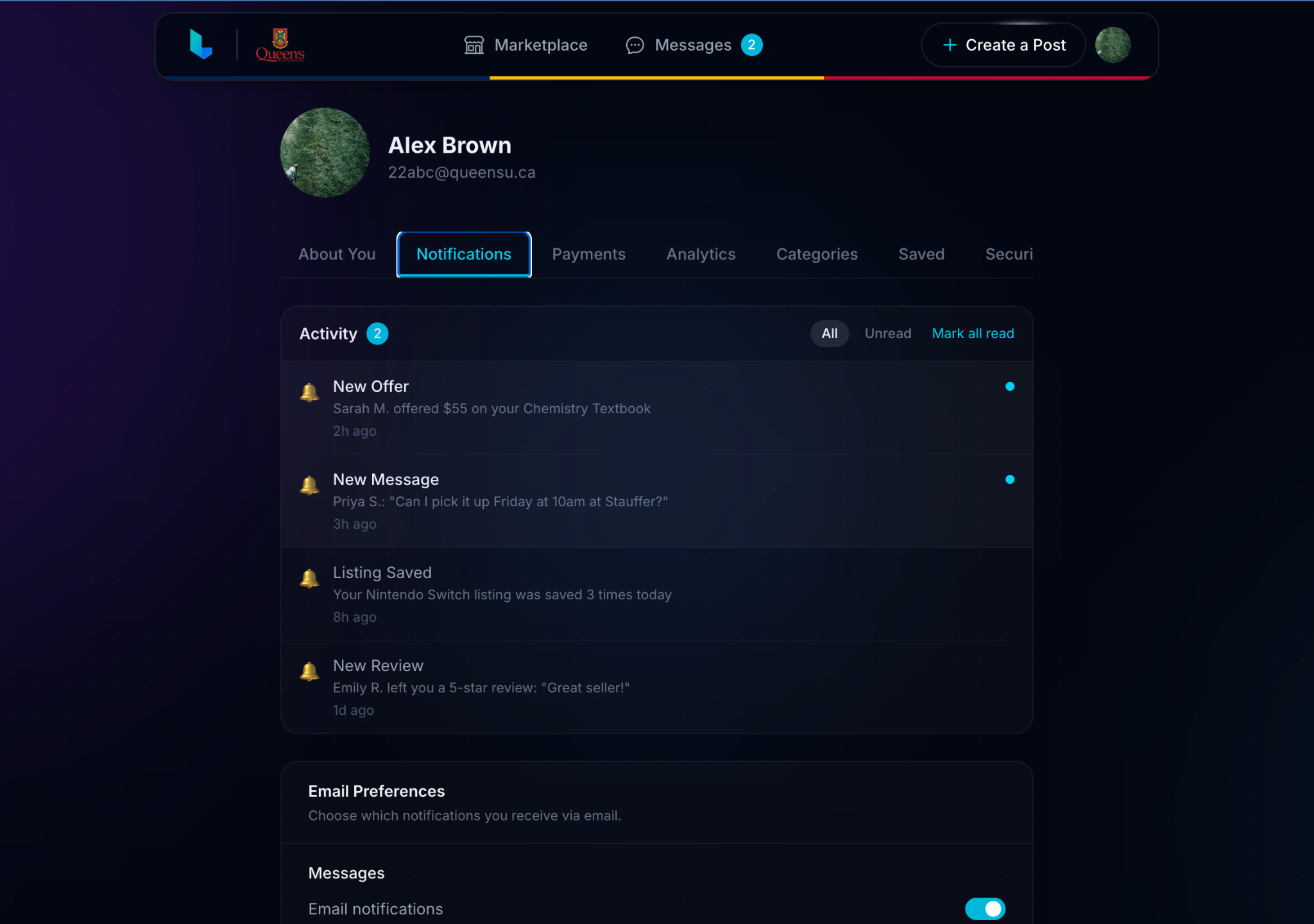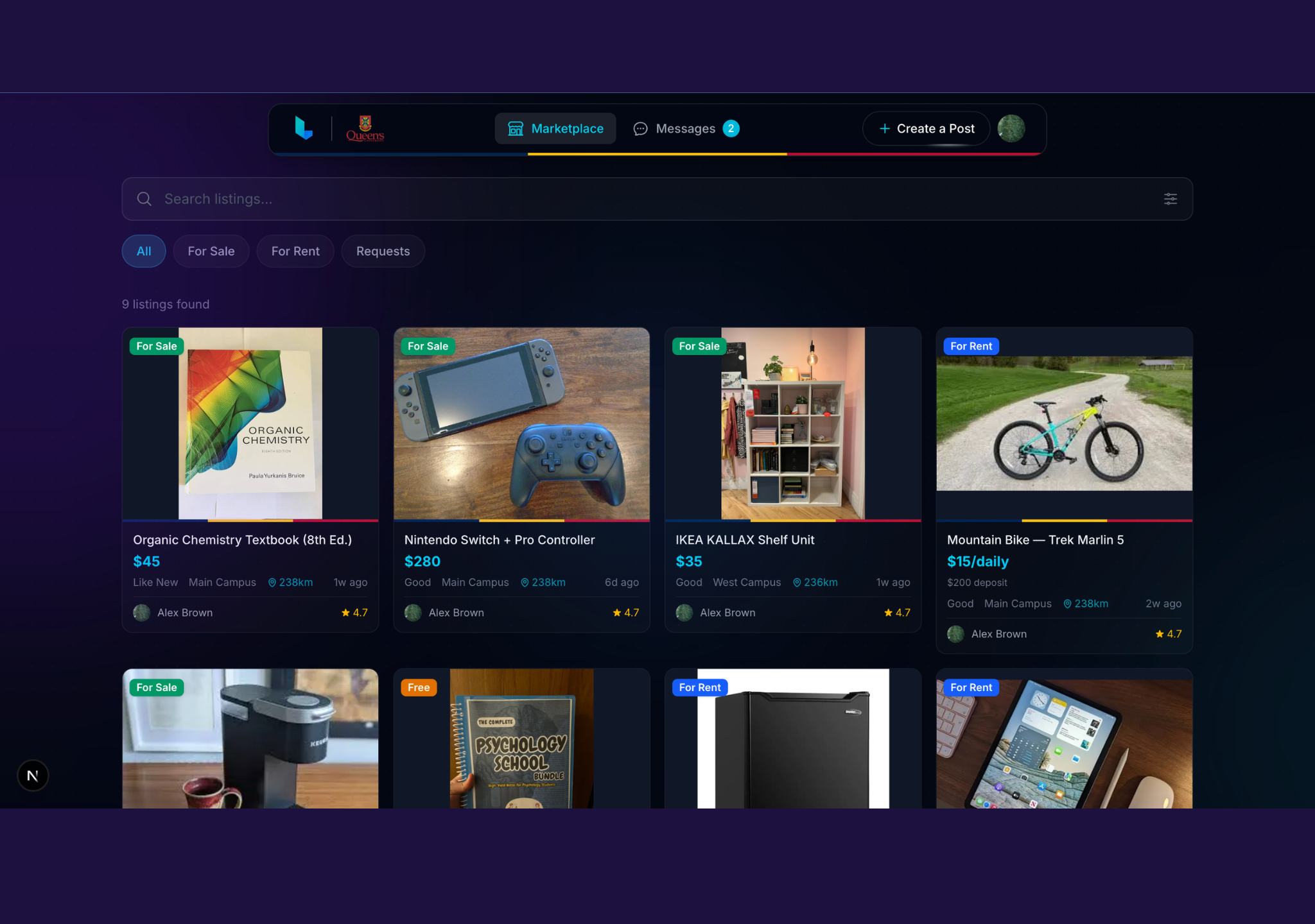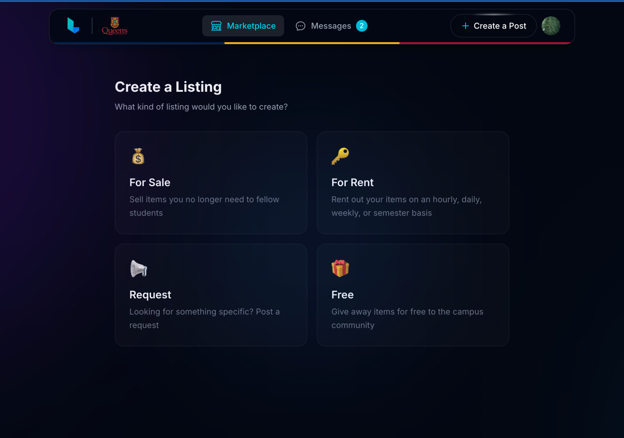 We're launching exclusively at Queen's University first, but plan to expand soon! You sign up with your student email, which means every person on the platform is part of your campus community. This keeps things trusted, local, and relevant to student life.