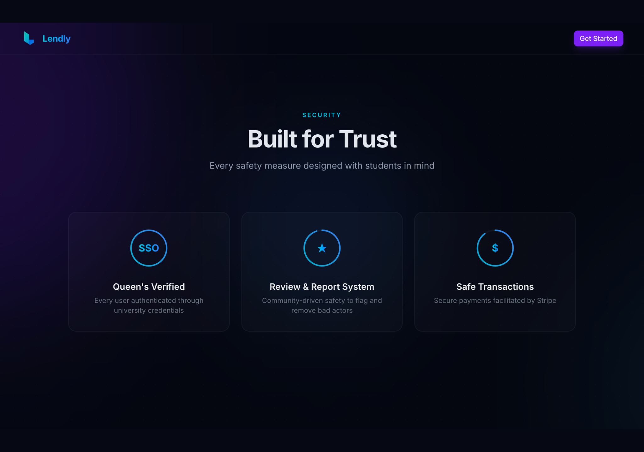Every user on Lendly is verified through their student email, meaning no anonymous accounts. You're lending to and borrowing from real, identifiable students at your university, not random strangers from the internet. Meetups happen on campus in public, familiar locations.