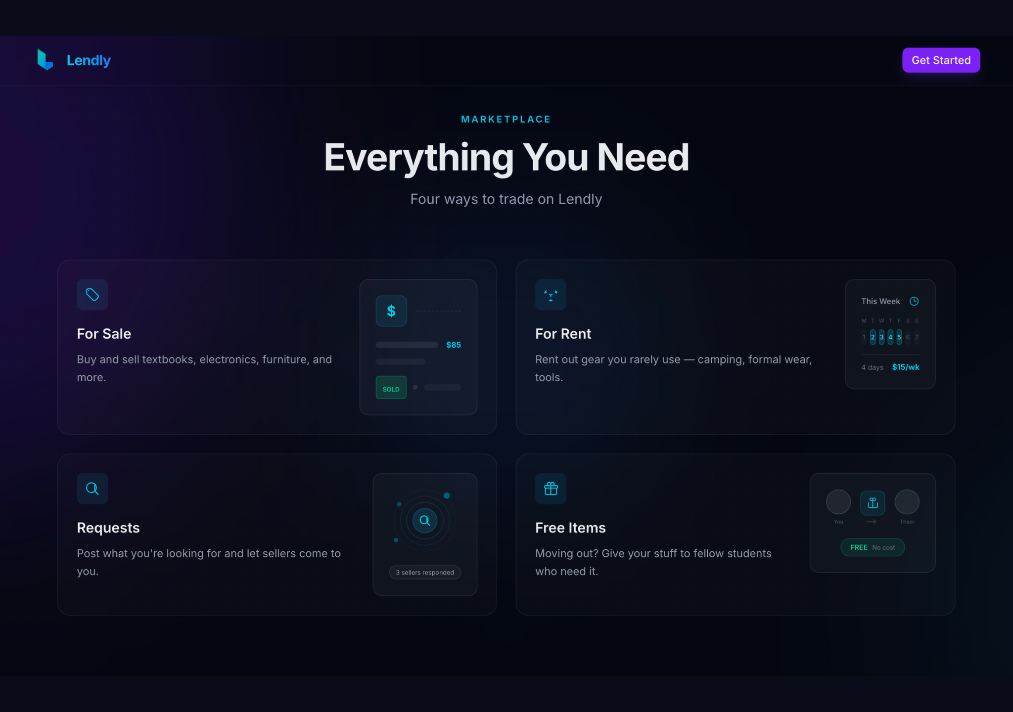 Other marketplaces are open to everyone, which means unverified listings, sketchy meetups, and zero student context. Lendly is specifically built for students: clean listings, verified identities, campus meetup spots, and a lending model so you don't have to buy things you'll only use once.